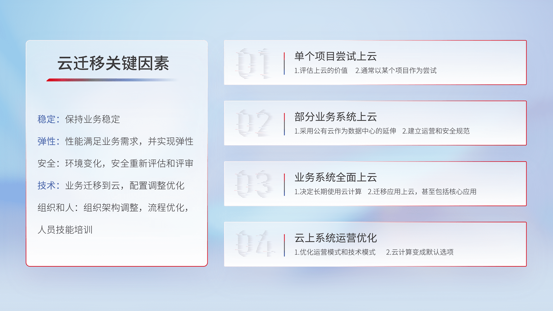 结合实际业务,,从规划设计、、、云平台选型、、云原生改造、、、数据迁移、、集成交付,,,,迁移全过程为客户识别最佳上云路径,,做好风险识别管理,,,设计网络架构、、、、身份权限、、安全审计合规、、、操作审计、、、、日志审计、、监控告警策略、、、多站点容灾设计等,,对云上基础设施进行整体规划,,提升IT治理水平,,,,以满足弹性、、、、高可用、、高性能的需求。。。。